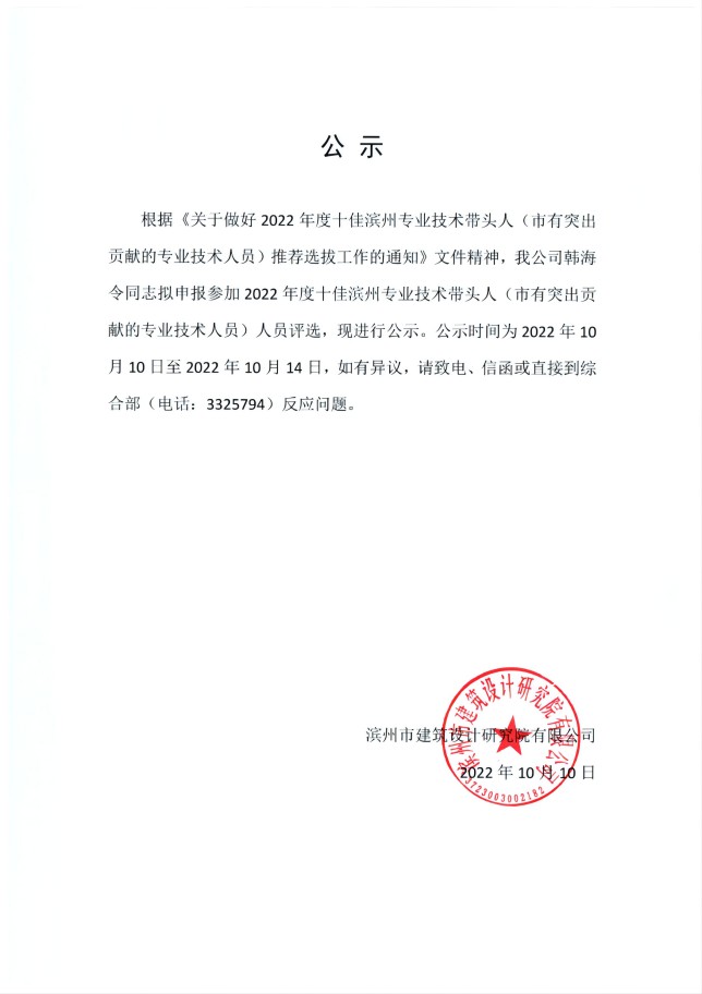 韓海令同志擬申報參加2022年度十佳濱州專業(yè)技術帶頭人評選的公示
